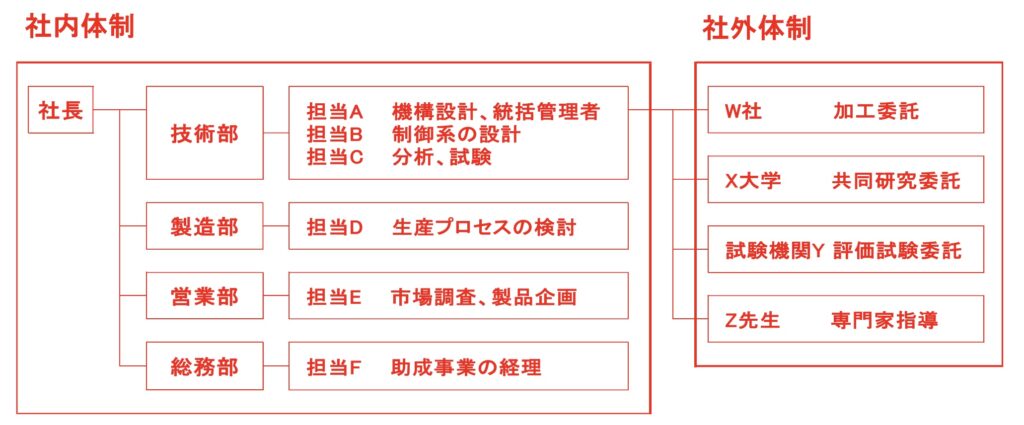 具体的には、自社でできない技術開発はどこに外注するのか、自社にないノウハウを補うのにどのような専門家と委託契約するのか、試作品の品質検査はどこの大学や公設研究機関に委託するのか、必要な資金はどこから調達するのか、等々を体制図を作成して、プロジェクトメンバーの特徴と分担する役割を説明することが求められます。ときどき耳にする産官学金連携とは、産は企業間、官は行政や公設研究機関、学は大学、金は金融機関、ということで、社会的インパクトの大きなプロジェクトほど、この連携体制の盤石さが求められます。