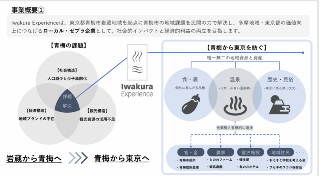 この企業は東京の青梅市の岩蔵と言う地域の課題を、青梅市と東京都の発展に繋げる取組を行っている ” 東京発のローカル・ゼブラ ” です。