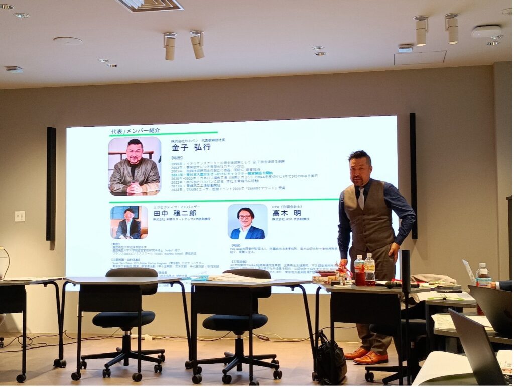 自社の取組をプレゼンする株式会社カネバンの金子弘行社長。